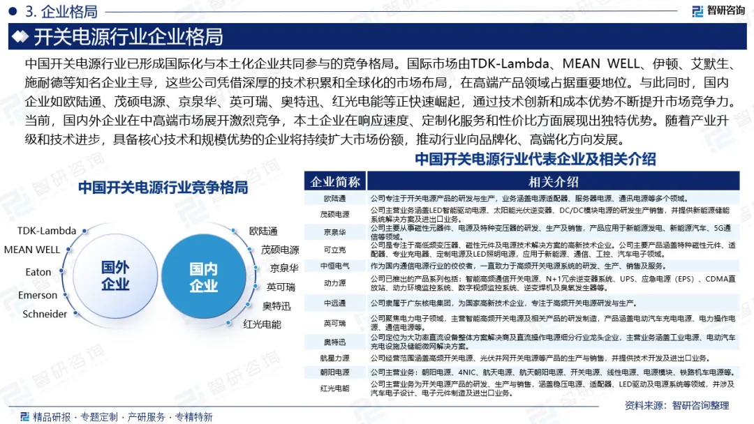 企业格局:中国开关电源行业已形成国际化与本土化企业共同参与的竞争格局。国际市场由TDK-Lambda、MEAN WELL、伊顿、艾默生、施耐德等知名企业主导,这些公司凭借深厚的技术积累和全球化的市场布局,在高端产品领域占据重要地位。与此同时,国内企业如欧陆通、茂硕电源、京泉华、英可瑞、奥特迅、红光电能等正快速崛起,通过技术创新和成本优势不断提升市场竞争力。当前,国内外企业在中高端市场展开激烈竞争,本土企业在响应速度、定制化服务和性价比方面展现出独特优势。随着产业升级和技术进步,具备核心技术和规模优势的企业将持续扩大市场份额,推动行业向品牌化、高端化方向发展。