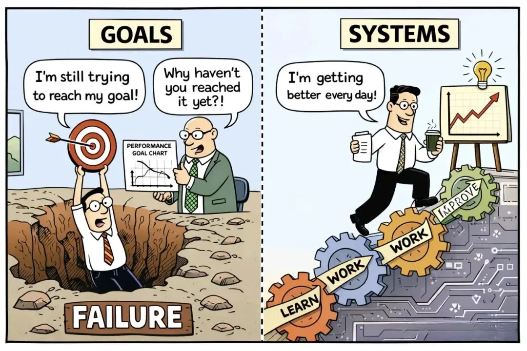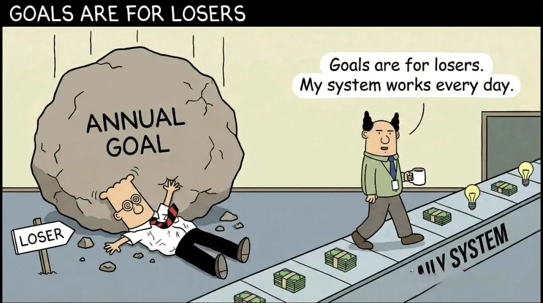 ② “系统”本身的定义模糊性:亚当斯对“系统”的定义是功能性的(“提升长期幸福概率”),这在哲学上很优美,但在实践中可能导致模糊。如何判断一个系统是“好的”系统?一个“每天尝试一种新的商业模式”的系统,听起来很积极,但也可能导致精力分散、浅尝辄止。一个有效的系统需要有明确的反馈回路和迭代机制,而这一点在亚当斯的原始论述中并未得到充分强调。 ③可能导致方向迷失和自我满足:过度沉迷于系统本身,而缺乏一个远期方向(目标)的指引,可能会让人陷入“为了执行而执行”的陷阱。一个人可以完美地执行一个“每天写500字平庸小说”的系统,并从中获得满足感,但这可能永远无法让他成为一个优秀的作家。系统需要被一个有意义的愿景或方向所引导,以避免陷入低水平的勤奋。