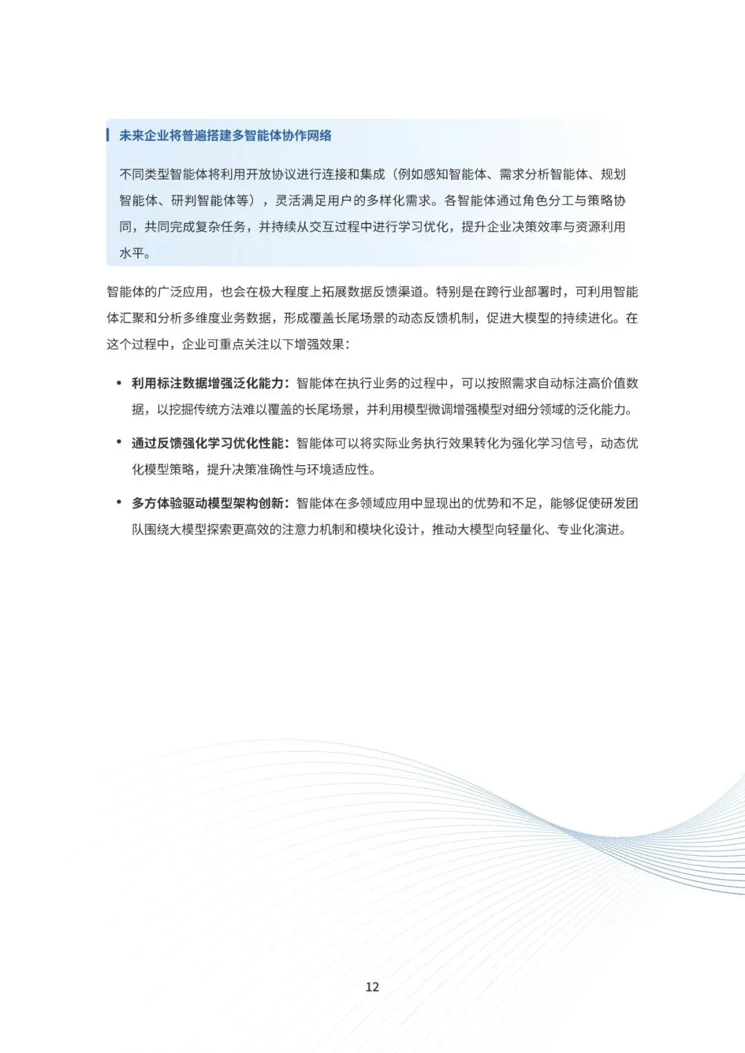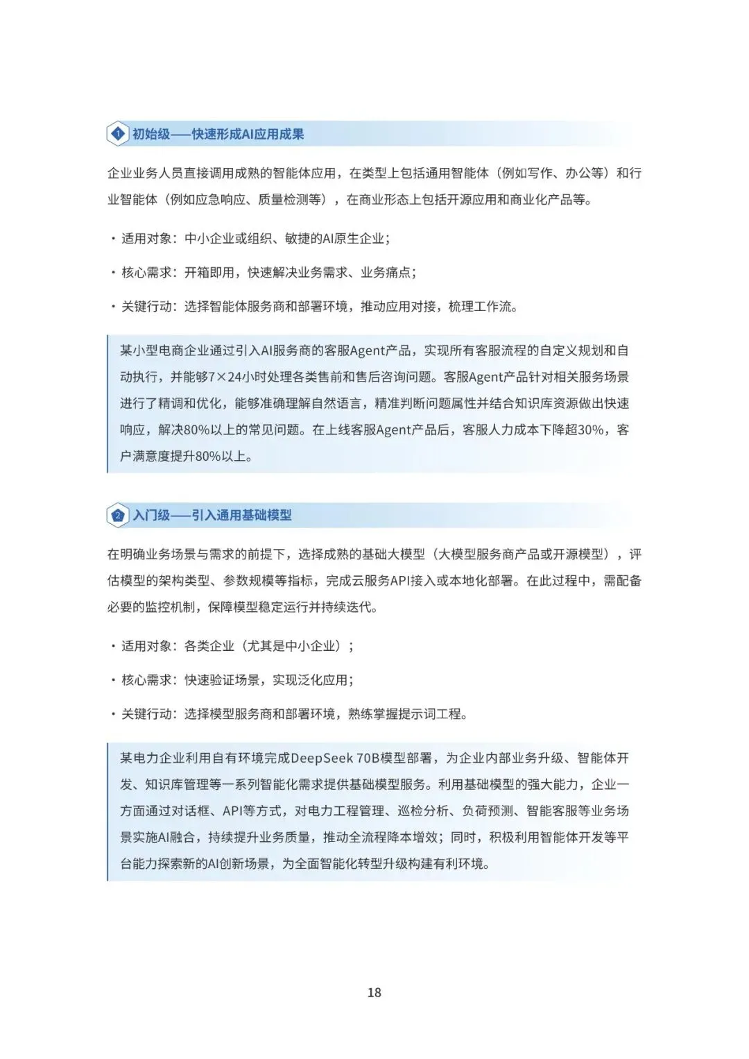 今天分享一份IDC与移动云联合发布的《企业AI开发与技术实践白皮书2025》,白皮书探讨了在GenAI时代,企业如何利用大模型技术实现智能化转型。白皮书指出,大模型能力的不断提升为企业带来了无限想象力,但也面临着战略规划、数据治理、算力资源、场景适配等方面的挑战。企业需要构建覆盖顶层设计、技术选型、数据治理、应用开发、运维运营及安全保障的全栈AI能力体系,并根据自身情况选择合适的落地路径,例如快速应用成熟的智能体、引入通用基础模型、构建外部知识库、持续提升模型能力和专业性,以及自主训练基础大模型等。移动云提供了全栈智算体系,支持企业从初级到专业级的AI开发需求,助力企业实现智能化转型升级。扫码加入[XG云数智·知识岛]即可随时下载最新5G、6G、人工智能、数据产业资料!资料已上传