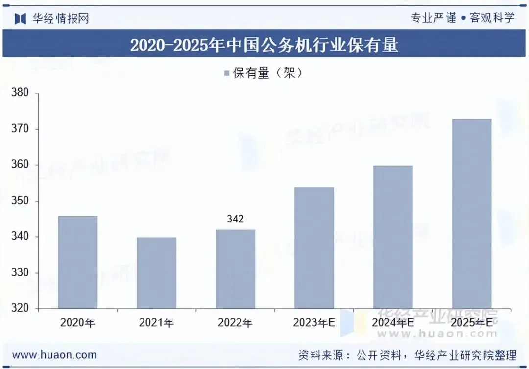 2022年中国公务机行业保有量为342架,折射出市场在政策与需求双重驱动下的起步态势。彼时,低空空域开放试点逐步推进,高净值人群对高效私密出行的需求已开始释放,但受运营成本高、服务体系待完善等因素制约,增长较为稳健。预计2025年保有量将增至373架。