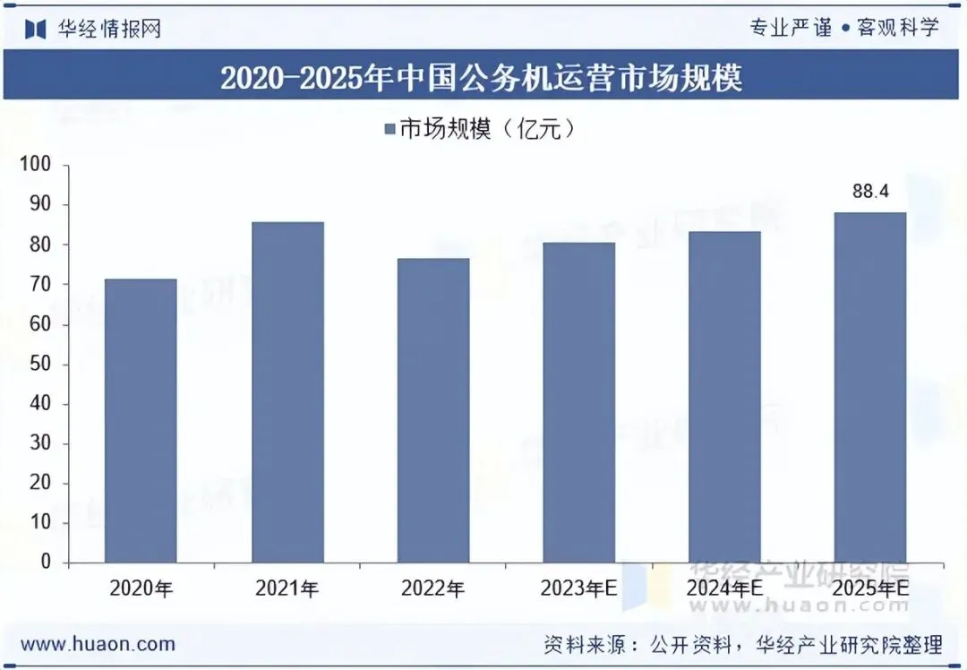 2022年中国公务机运营市场规模达76.9亿元,预计2025年规模将增至88.4亿元,增长动力清晰可见,低空空域改革深化提升运行效率,跨境出行需求增长带动超远程机型运营活跃,且FBO等配套服务能力持续升级,多重利好推动行业从培育期向规模化发展稳步迈进。