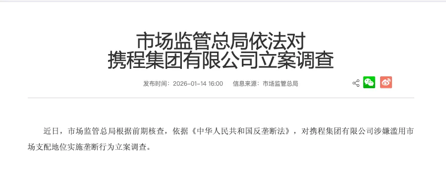 2026年1月14日,市场监管总局一纸公告,将携程集团推上了风口浪尖,因涉嫌滥用市场支配地位实施垄断行为,这家在线旅游巨头被正式立案调查。