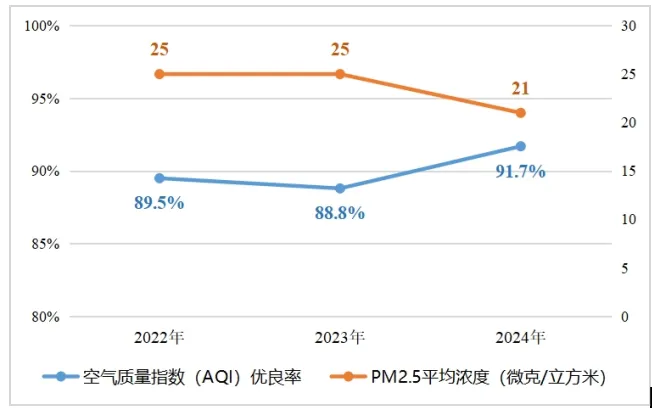 全年国控站点空气质量指数优良天数为322天,优良率达到88.5%,保持全市第一,PM2.5平均浓度为21微克/立方米。全区27个地表水考核断面达标率100%,全部达到或好于Ⅲ类水,饮用水源地水质达标率为100%。