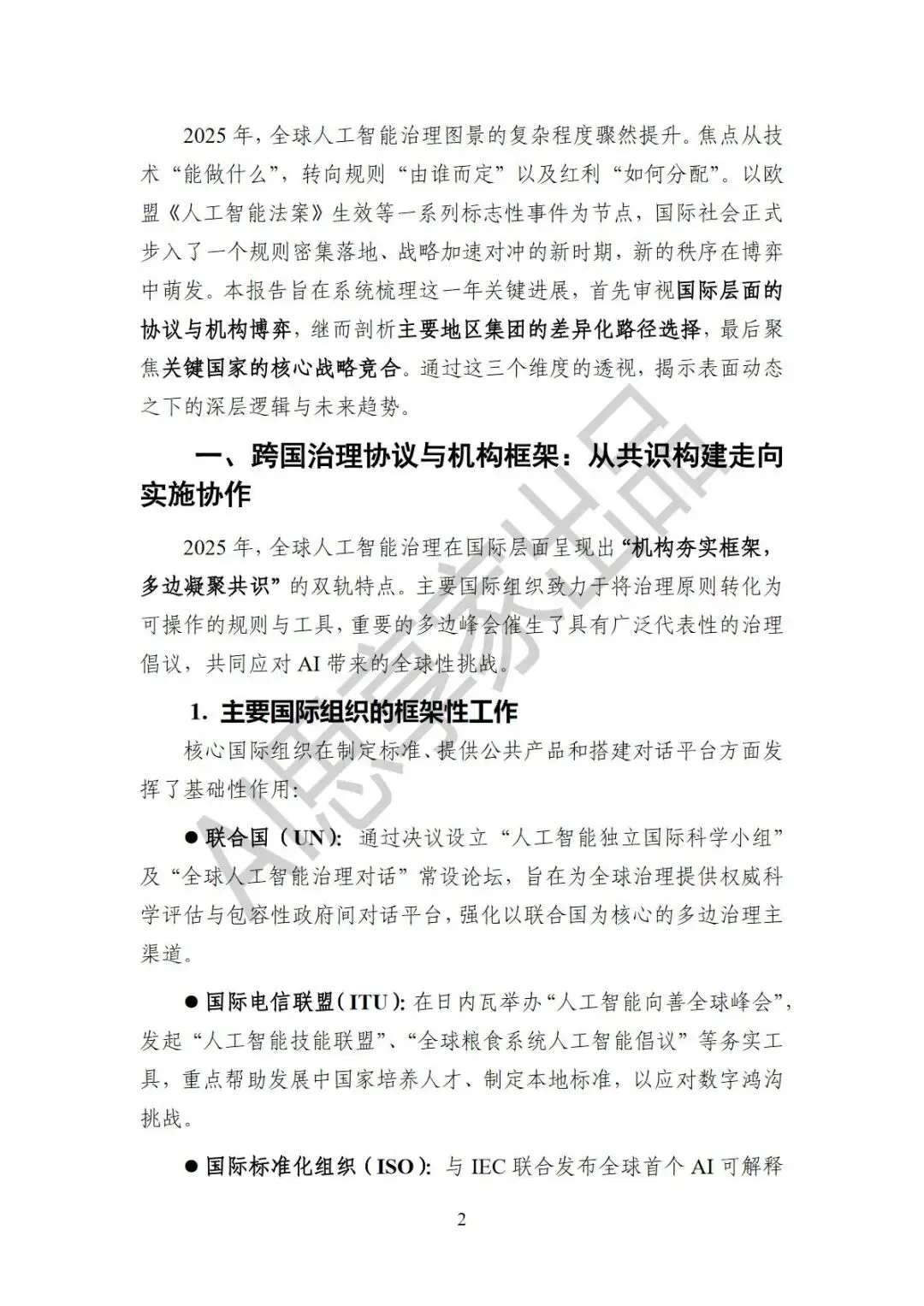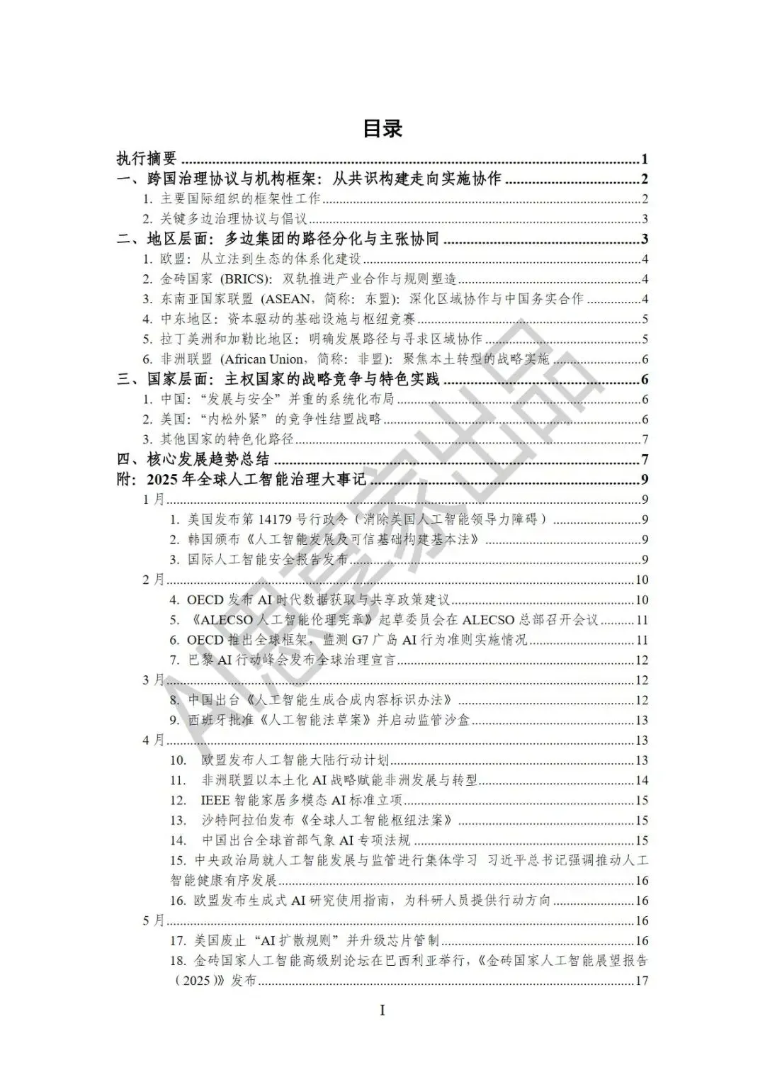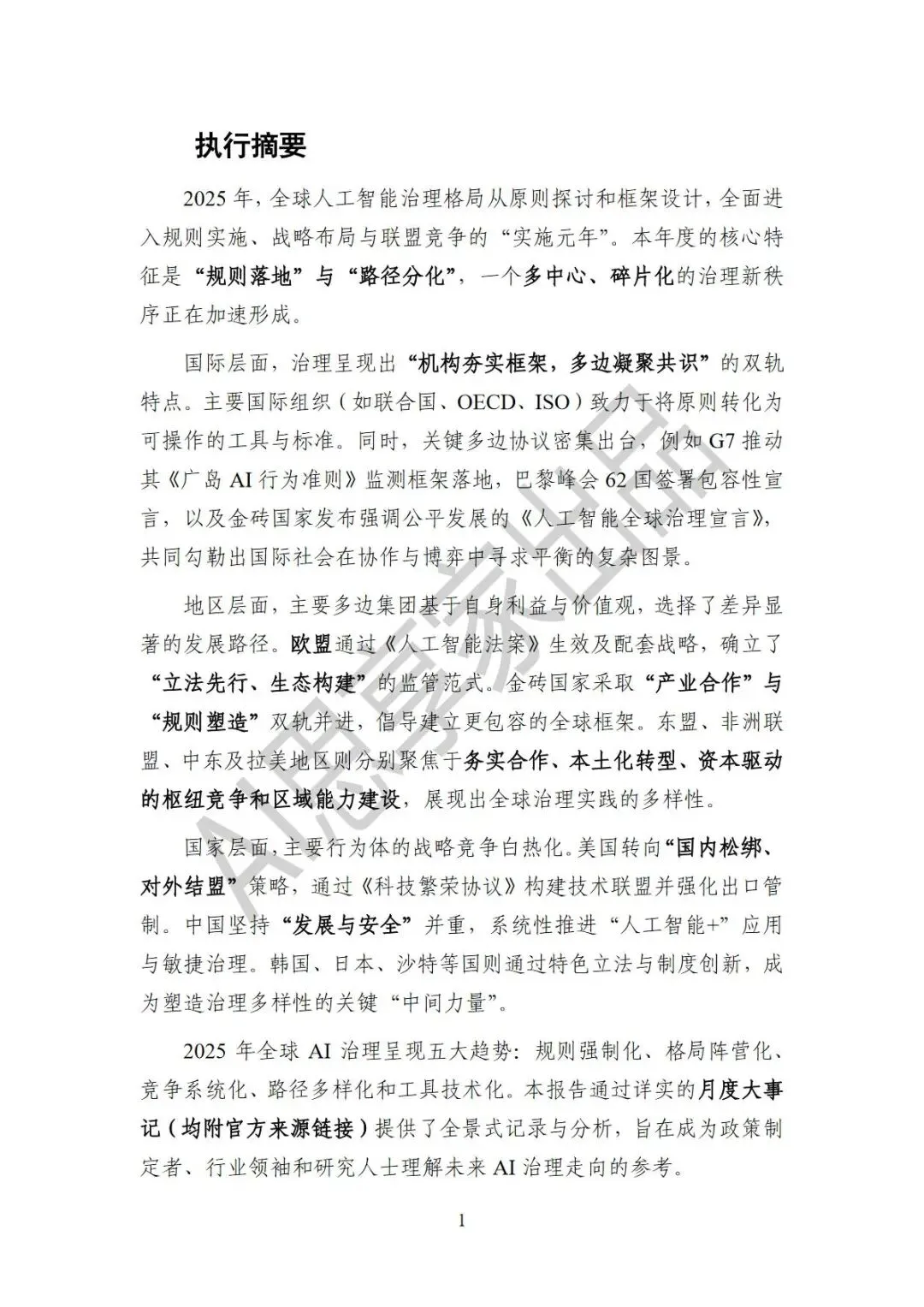 2025年作为全球人工智能治理的实施元年与分化元年,治理格局实现从原则探讨到规则落地、战略博弈的关键跨越。这一年,国际组织加速将治理原则转化为标准工具,多边协议密集出台,勾勒出协作与竞争交织的复杂图景。地区层面,欧盟构建“立法先行+生态构建”监管体系,金砖国家以“产业合作+规则塑造”双轨推进,东盟、非盟等则立足自身需求探索差异化路径。报告从跨国协议、地区实践、国家战略三维度,系统梳理全年治理进展,提炼规则强制化、格局阵营化等五大核心趋势,并附详实月度大事记,为政策制定者、行业领袖及研究人士提供权威参考,助力把握全球AI治理的深层逻辑与未来走向。