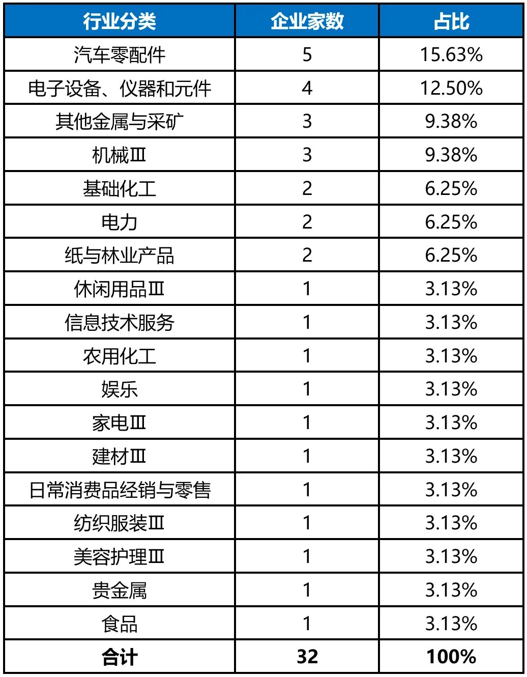 32家企业共涉及18个细分行业,主要行业分别为:汽车零配件(5家)、电子设备、仪器和元件(4家)、其他金属与采矿(3家)和机械Ⅲ(3家),合计占全部新增受理企业的46.89%。新增受理企业数为2家的行业共3个、为1家的行业共11个,行业分布情况如下表: