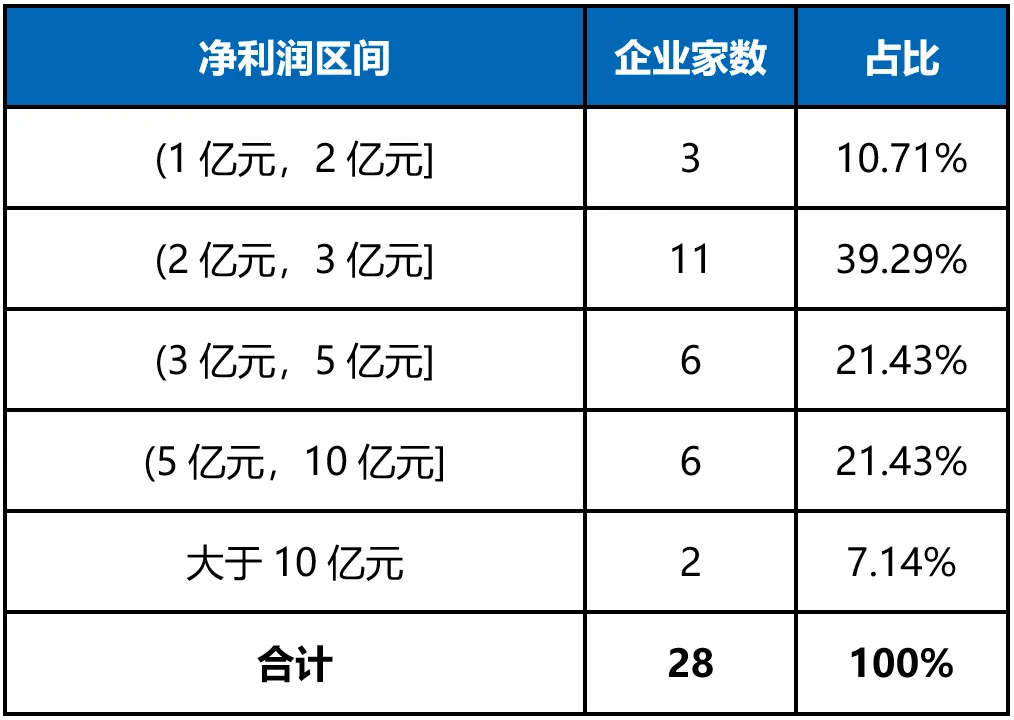 28家企业净利润均超过1亿元,其中有14家在1亿元-3亿元区间,占比50.00%;2家在10亿元以上,占比7.14%,净利润最高的达32.03亿元。净利润分布如下表: