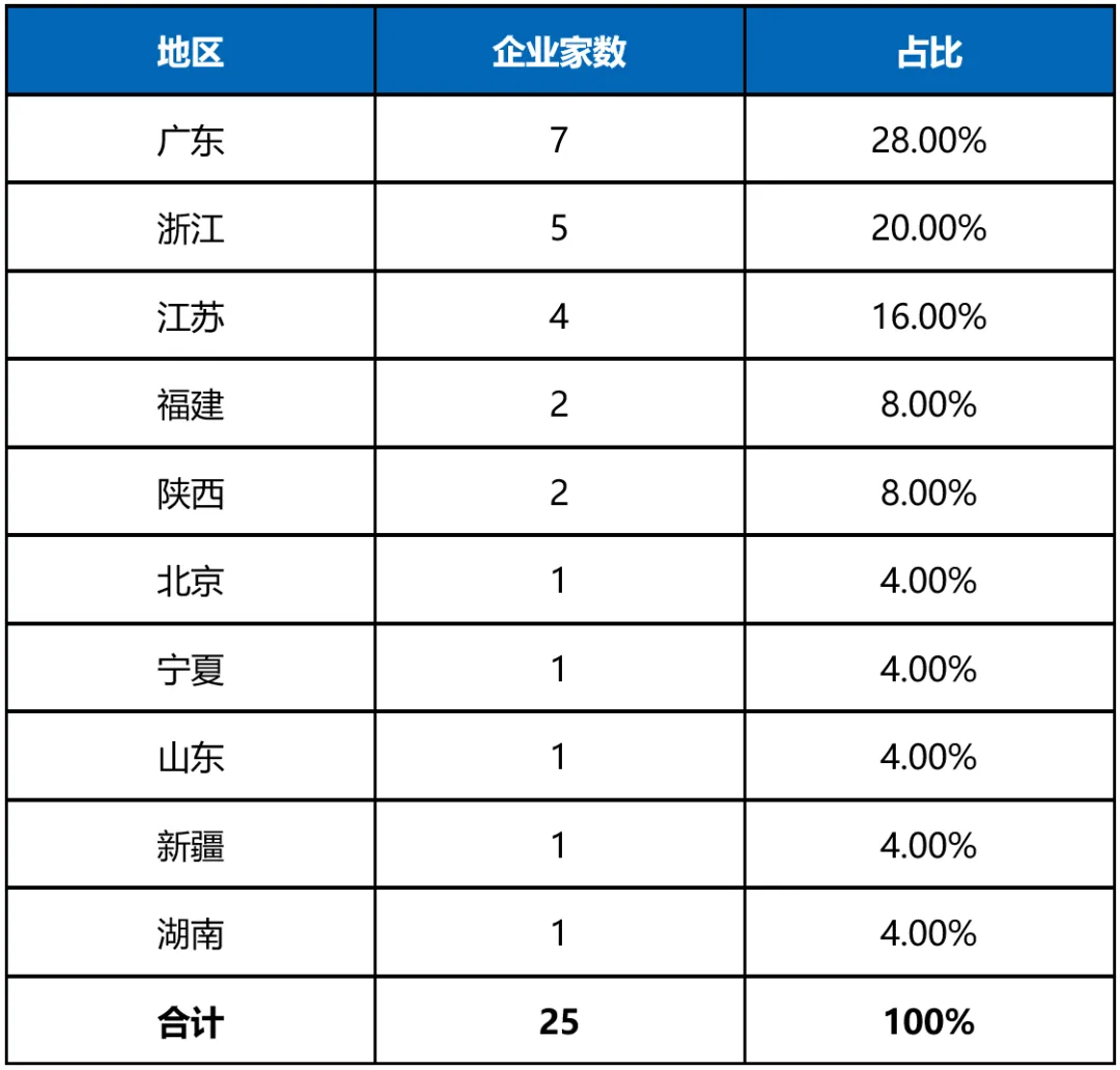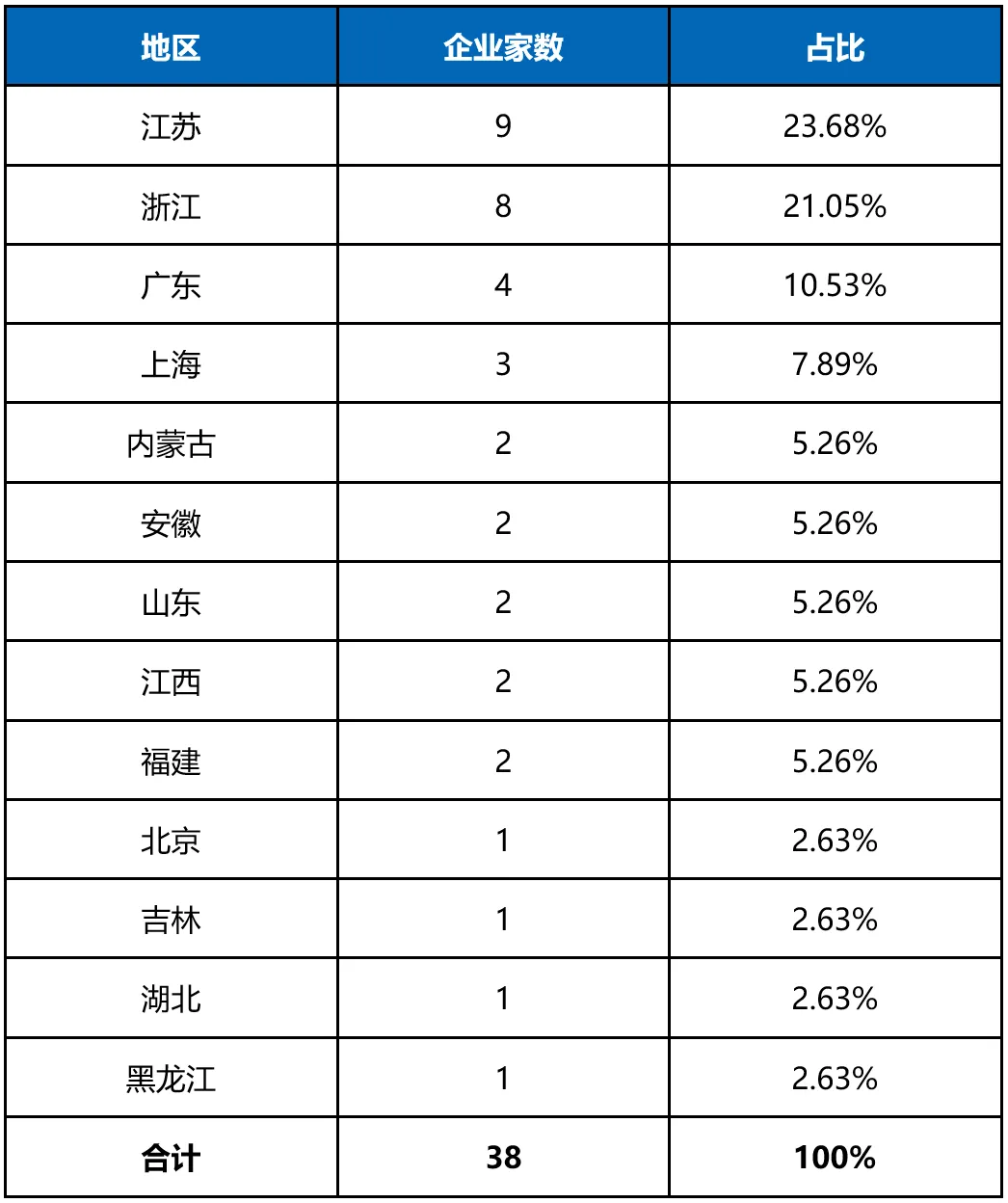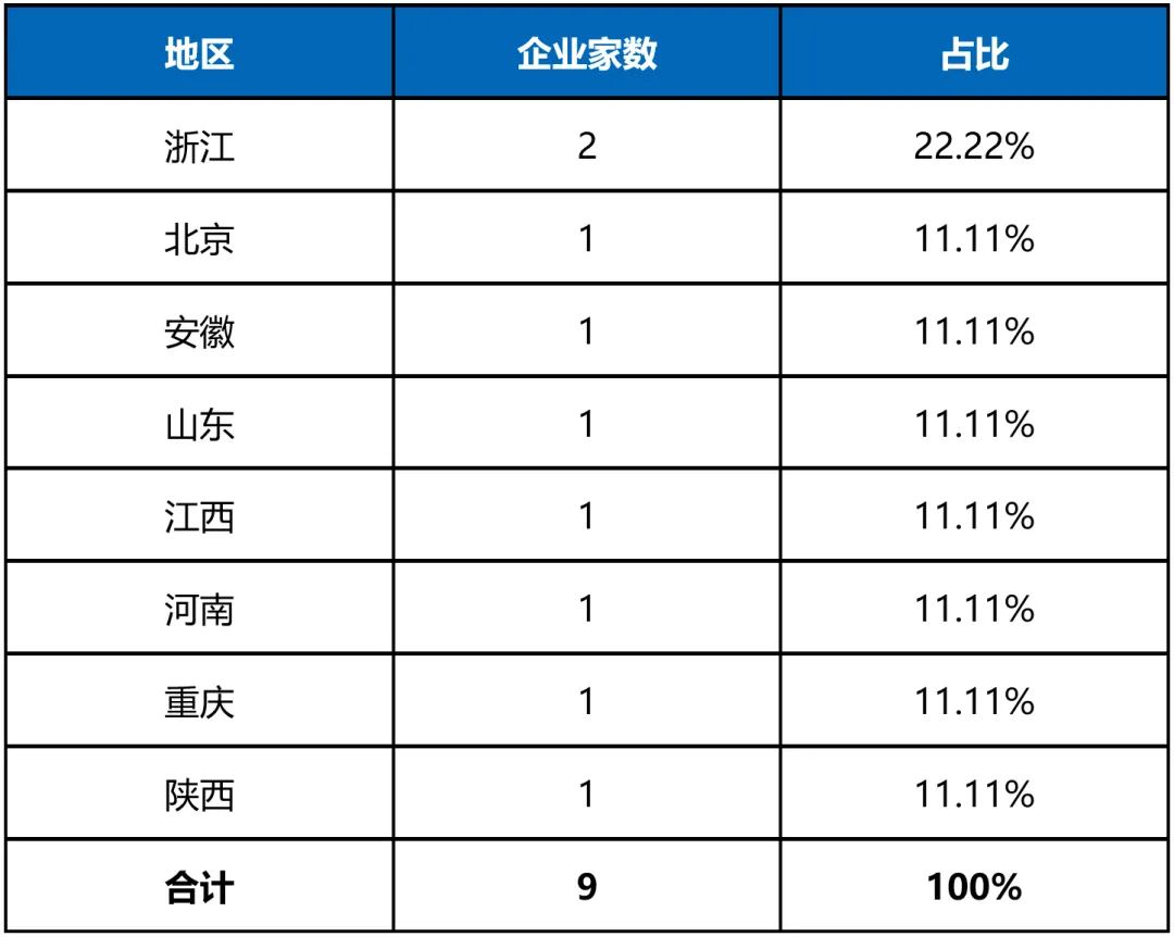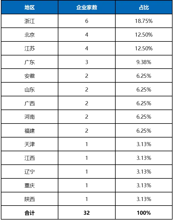 32家企业涉及14个地区,主要地区分别是浙江(6家)、北京(4家)、江苏(4家)、广东(3家),合计占比53.13%。具体如下表: