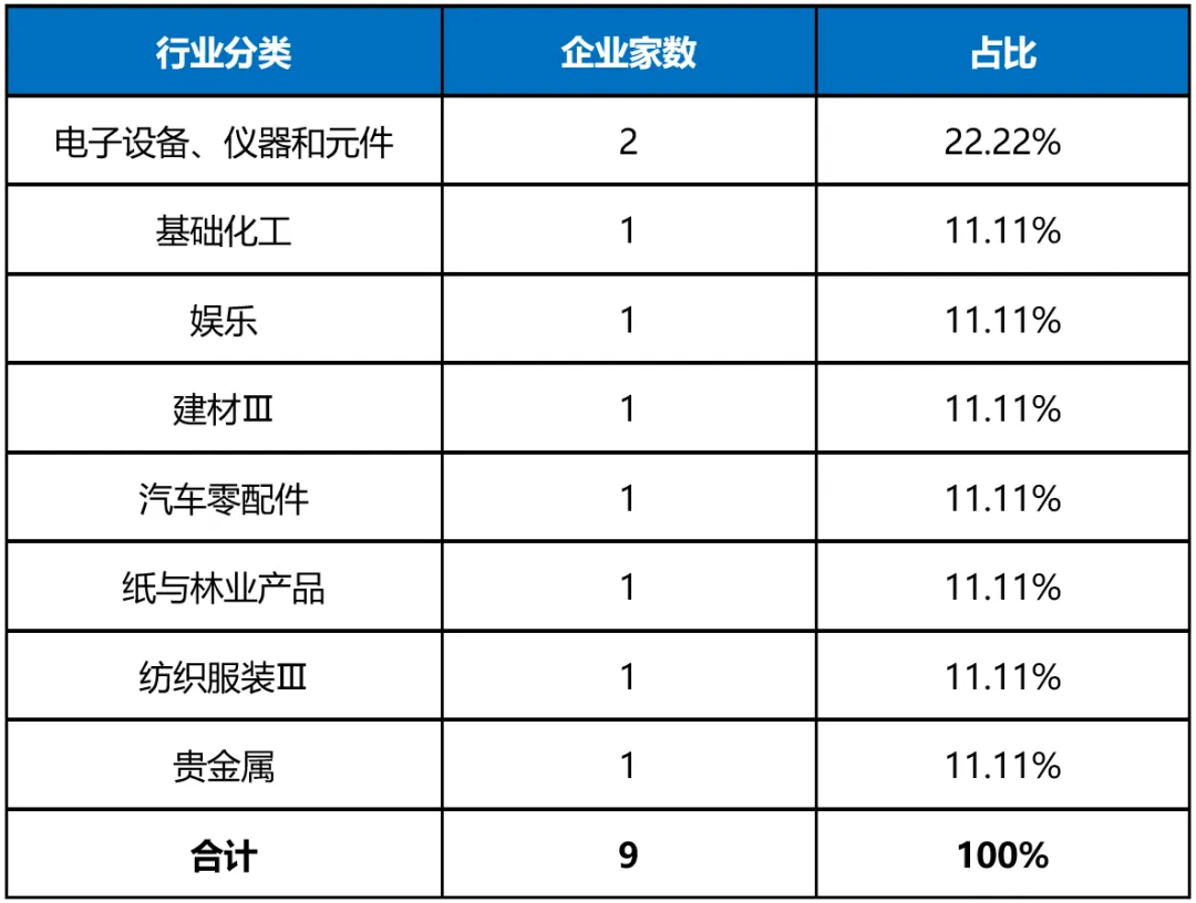 9家企业共涉及8个细分行业,行业分布情况如下表: