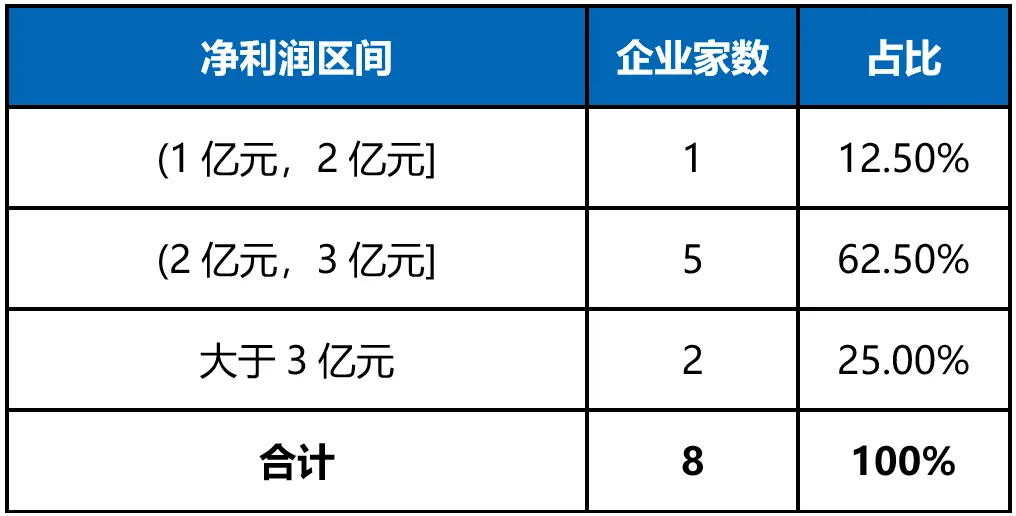 8家企业净利润均超过1亿元,其中有6家在1亿元—3亿元区间,占比75.00%;2家在3亿元以上,占比25.00%,净利润最高的达7.54亿元。净利润分布如下表: