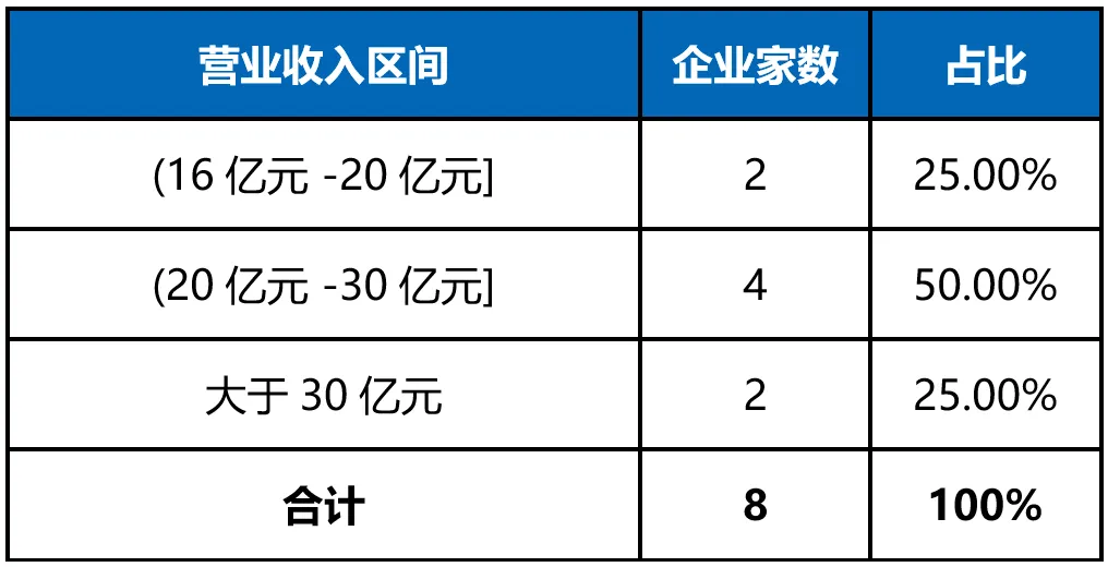 8家企业的2024年营业收入均超过16亿元,其中2家在30亿元以上,占比25.00%,营业收入最高的达到44.39亿元。企业营业收入的分布如下表: