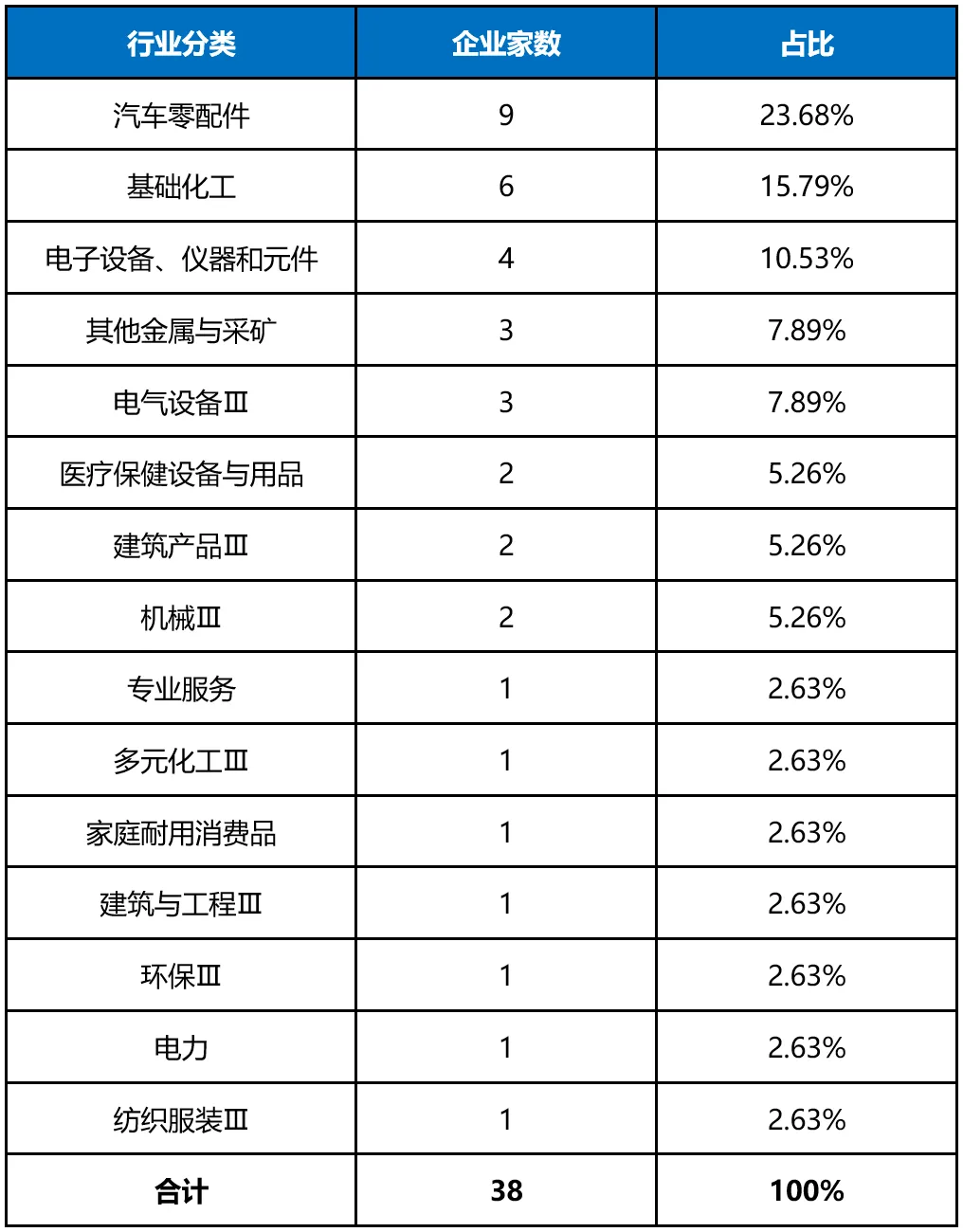 38家新增上市公司共涉及15个细分行业,主要的行业分别为:汽车零配件(9家)、基础化工(6家)、电子设备、仪器和元件(4家)、其他金属与采矿(3家)和电气设备Ⅲ(3家),合计占比65.78%。行业分布情况如下表: