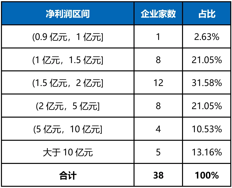 这38家企业净利润均超过0.9亿元,其中有9家在0.9亿元—1.5亿元区间,占比23.68%;有5家在10亿元以上,占比13.16%,净利润最高的达到94.80亿元。38家企业净利润的分布如下表: