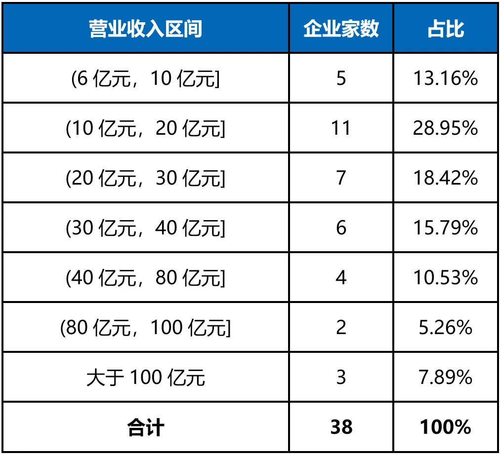 38家企业营业收入均超过6亿元,其中有11家在10亿元—20亿元区间,占比28.95%;有3家在100亿元以上,占比7.89%,营业收入最高的达到392.55亿元。38家企业营业收入的分布如下表:
