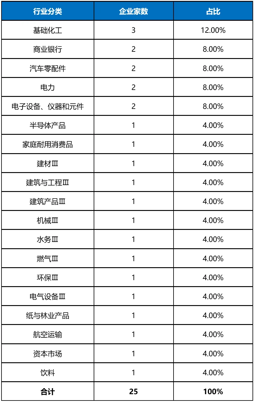 25家企业共涉及19个细分行业。主要的行业分别为:基础化工(3家)、商业银行(2家)、汽车零配件(2家)、电力(2家)和电子设备、仪器和元件(2家),合计占比44.00%。行业分布情况如下表:
