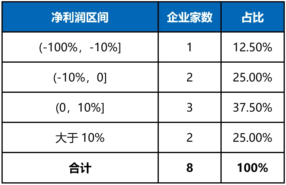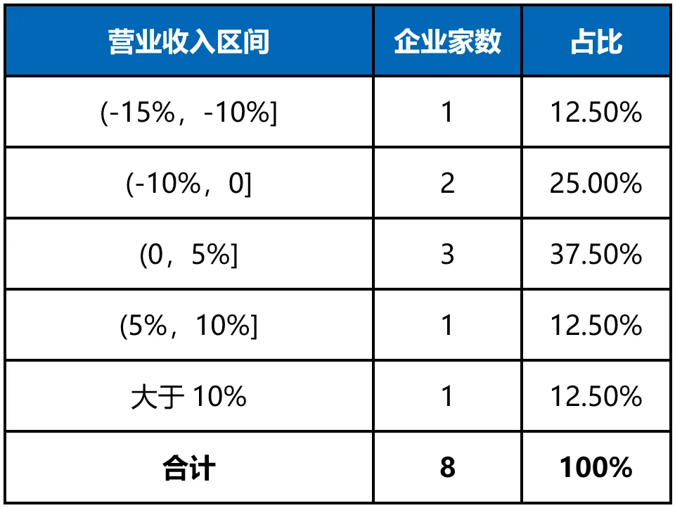 8家企业中2024年营业收入同比下滑15%到10%的有1家,占比12.50%;合计3家企业营业收入同比2023年减少,占比37.50%。