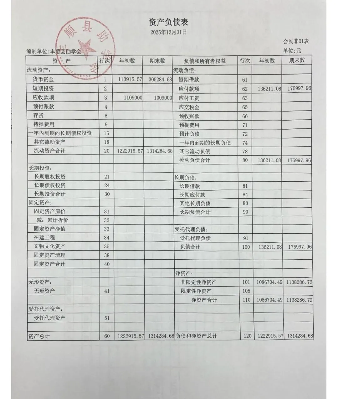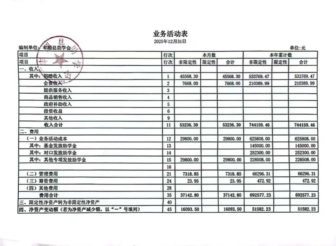 二、2025年12月理事单位、会员交费、捐款名单、支出明细公布交费会员名单:1、陈虎100元2、张炜100元3、罗天豪100元4、陈旭江100元5、张细珍100元6、陈大伟100元7、曾媛100元8、黄书颂100元9、陈肇媛100元10、曾利红200元(25、26年)11、陈恩铁100元(26年)12、罗小明100元13、徐伟100元14、曾媛100元15、黄瑞忠100元16、李巧艳200元(25、26年)17、朱伦达200元(25、26年)18、黄远招100元19、罗友莲100元(26年)20、陈爱红200元(26年)21、徐位林100元(26年)22、徐锋100元(26年)23、李晓维100元(26年)24、邱少芬100元(26年)25、罗长军100元(26年)26、丘达平100元(26年)27、罗楚芬100元(26年)28、冯河滔100元(26年)29、刘尔兴100元(26年)30、廖小萍100元(26年)31、陈小英100元32、徐丹丹100元33、曾宝花100元(26年)34、蓝日景100元(26年)35、吴寿松100元(26年)36、洪映云100元37、黄赛娇100元38、黎能文100元(26年)39、罗佳华168元(26年)40、陈小晖100元(26年)41、张细梭100元(26年)42、邱嫦雯100元(26年)43、吴燕燕200元(25、26 年)44、蔡淑华100元(26年)45、钟琪 100元46、刘远明100元(26年)47、邱文浩100元(26年)48、杨睦凡100元(26年)49、徐位添100元(26年)50、丁畏华200元(26年)51、胡学锋100元(26年)52、陈开权100元(26年)53 、徐春愉100元(26年)54 、刘慧慧100元(26年)55 、黄骏宏100元(26年)56 、钟瑜100元(26年)57、程来均100元(26年)58、詹冬青100元(26年)59 、朱旭枫100元(26年)60、陈志宏100元(26年)(合计:6668元)理事单位会费:1、理事单位畲山友云聚茶业(代表:罗佳华) 1000元(26年)(合计:1000元)评级专项费用:1、罗哲宏先生3000元2、张国亮先生2000元3、邱纯洵先生3000元 4、余昌辉先生5000元5、广东锦顺科技有限公司徐灵丰先生3000元6、深圳深源公司5000元(合计:21000元)会费收到捐款:1、中共丰顺县委社会工作部拔来两新党组织党建示范点建设工作经费10000元2、银行批量利息8.6元(合计:10008.6元)会费支出:1、文员10、11月份工资4400元2、11月份电费、水费共229.9元3、办公费用支出62.8元4、文员12月份社保1496.95元5、转账手续费12元6、两新党组织党建示范点建设工作经费10000元7、等级评估报名费用5800元8、服务经费7500元9、银行短信费10元10、邱威武的母亲仙逝帛金花圈300元三、2025年12月基金收到捐款名单如下:1、张锦有先生500元2、"11 月份「喜乐微光汇」"5200元3、陈华开先生200元4、游平兰女士200元5、陈玉梅女士1250元6、洪明崇先生捐4瓶药酒认购捐款200元7、陈缎花女士100元8、詹冬青女士100元9、蔡建东(大北哥)300元10、为“徐文佳”同学专项捐款16500元11、农行二维码捐款18.3元(12月1日-31日)12、银行批量利息19.45元(合计:24587.75元)对口助学金:1、罗哲宏对口助学金3400元(合计:3400元)基金支出:1、税费扣缴45.2元2、“徐文佳同学”专项捐款发放16500元3、购买会服冲锋衣8件784元(刘晓燕经手)4、银行短信费30元(合计:17359.2元)请大家审阅并指正,如有任何违规行为,可拨打办公室电话:0753-6680753。感谢您的关注和支持!