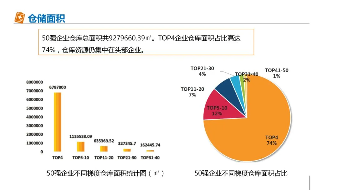 仓储前50企业仓库总面积共9279660.39㎡。前4企业仓库面积占比高达74%,仓库资源仍集中在头部企业,除前4以外,不同梯度企业仓库总面积以50%左右的比率减少。