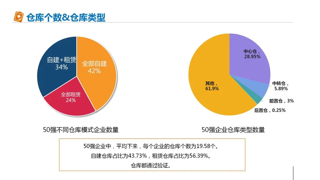 前50企业中,平均每个企业的仓库个数为19.58个。自建仓库占比43.73%,租赁仓库占比为56.39%。仓库都通过验证。仓库建设方式包括自建和租赁两种,其中34%的企业采用“自建+租赁”的方式,42%的企业采用自建的方式,24%的企业采用租赁的方式。