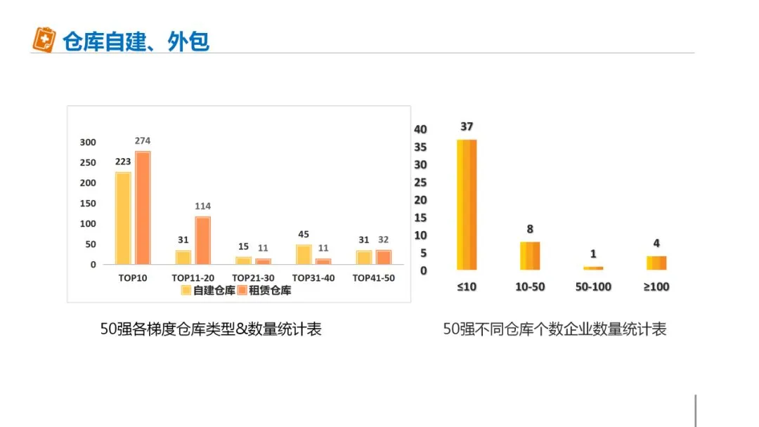 从上面左图可以看出,前10 、前11-20的企业租赁仓库的数量多于自建仓库,而其他梯度企业的自建仓库比例相对较高。从不同梯度企业的自建和租赁仓库数量来看,随着企业规模的不断扩大,边际效益递减,在企业达到一定规模后,租赁仓库经济效益更为可观。