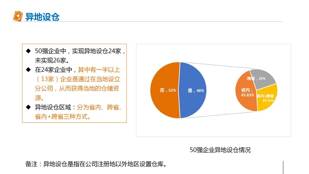 前50企业中,实现异地设仓24家,未实现异地设仓26家。