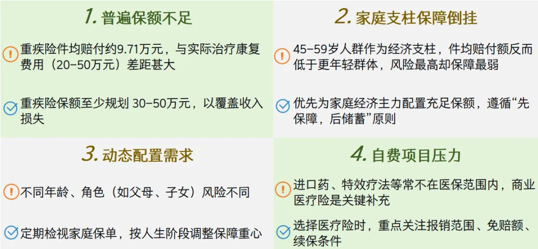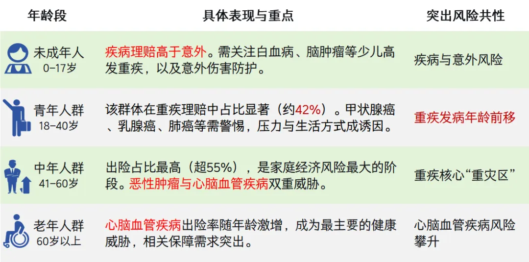 理赔数据清晰刻画了不同人生阶段的突出风险,保障需因人而异。