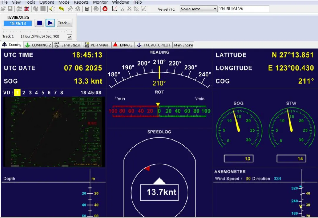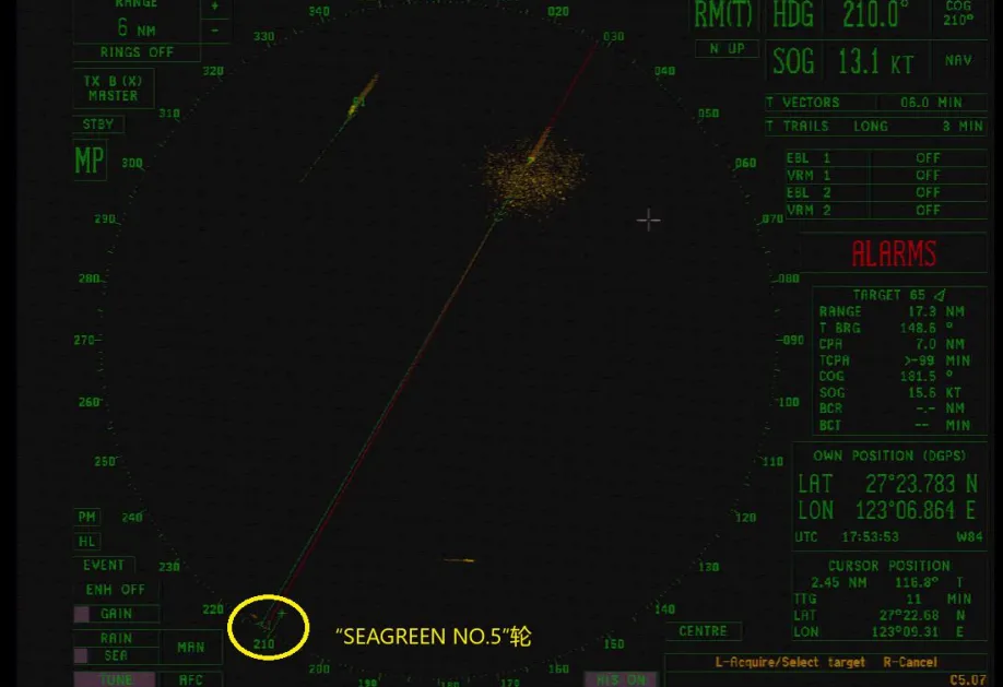 0154时,“YM INITIATIVE”轮船位27°23′.783N/123°06′.864E,航向210,航速13.1节,此时雷达首次探测到位于正前方偏右的不明物标(后被证实为“SEAGREEN NO.5”轮),无AIS信息,航向、航速未知,距离约9.52海里。