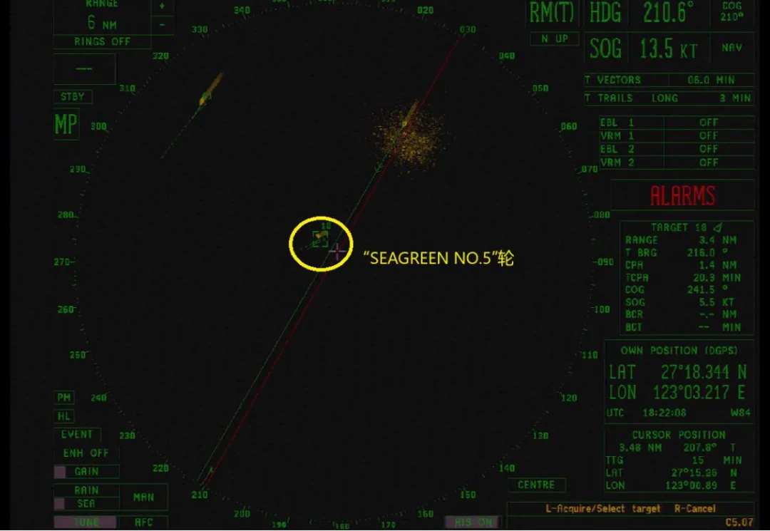 0222时,“YM INITIATIVE”轮船位 27°18′.344N/123°03′.127E,航向210,航速13.5节,首次标绘、锁定位于右前方的“SEAGREEN NO.5”轮(无AIS信息,雷达自动编号为“18”,航向241.5,航速5.5节,距离3.4海里,CPA1.4海里,该轮开始向左调整航向靠近“YM INITIATIVE”轮计划航向)。
