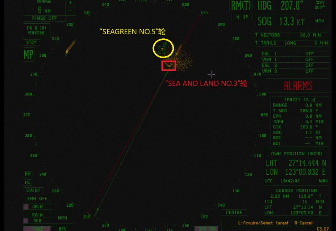 0242时,“YM INITIATIVE”轮船位27°14′.444N/123°00′.832E,航向207,航速13.3节,此时“SEAGREEN NO.5”轮过右正横(航向303.6,航速降至1.1节,距离和CPA为0.8海里),“SEA AND LAND NO.3”轮雷达回波位于正前方偏右,距离约0.72海里。
