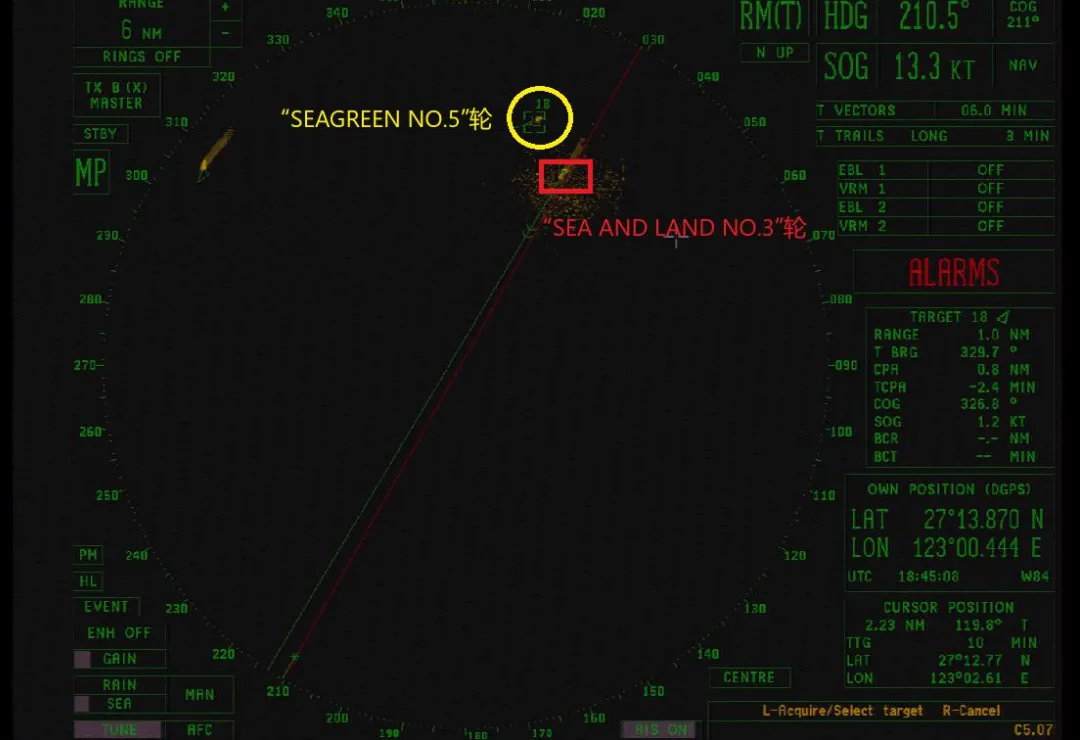 0237时,“YM INITIATIVE”轮船位27°15′.334N/123°01′.345E,航向208,航速13.3节,再次向左调整航向,避让右前方的“SEAGREEN NO.5”轮(航向232.5,航速降至1.9节,距离1.3海里,CPA0.8海里),此时“SEA AND LAND NO.3”轮雷达回波位于正前方偏右,距离约1.68海里。