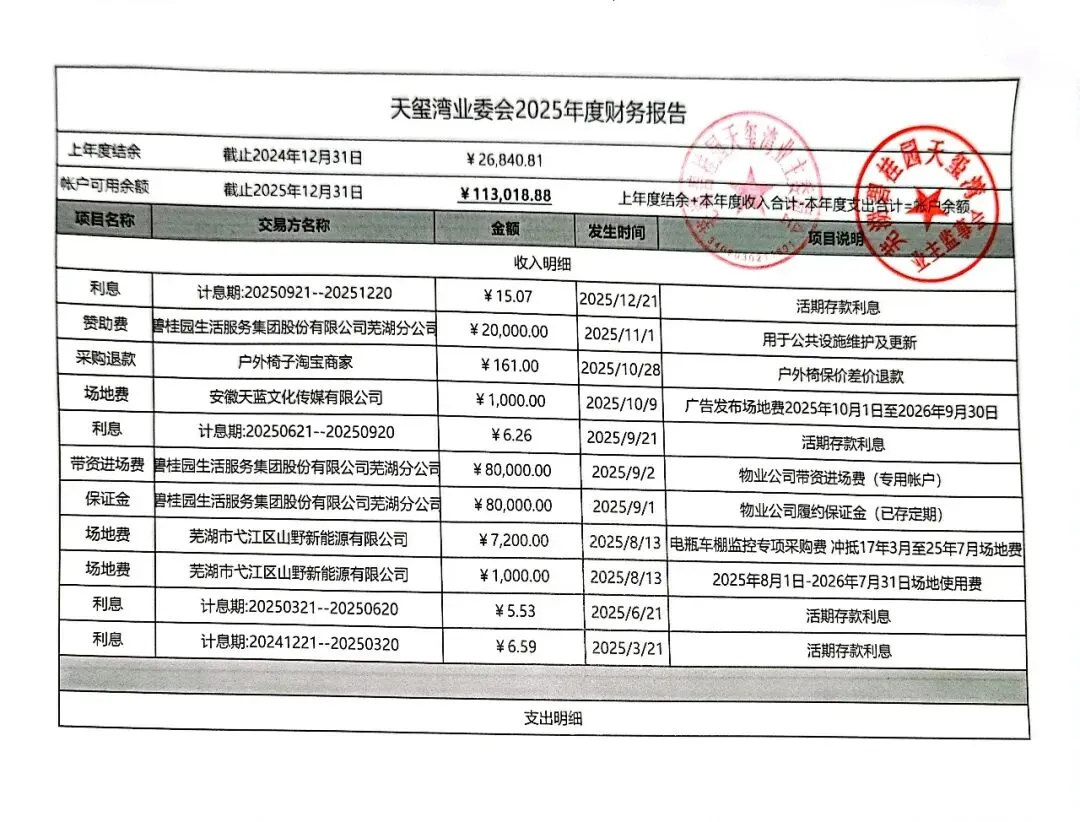 根据国家相关法律规定,现向全体业主公示天玺湾2025年度公共财务情况。