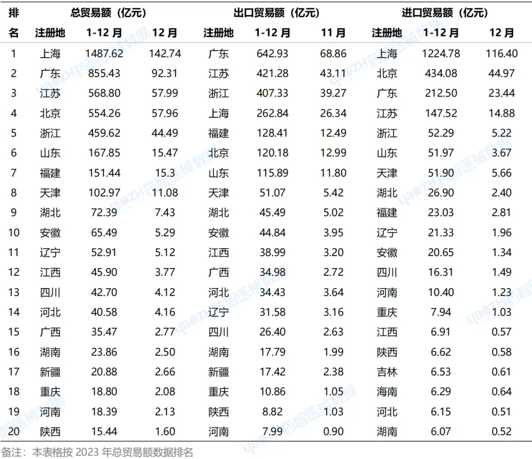 2、2023年中国医械各注册地进出口贸易额(前20名)从1-12月中国医疗器械各注册地进出口总贸易额来看,上海、广东、江苏位居前三名,其中上海2023年总贸易额为1487.62亿元,稳居榜首。