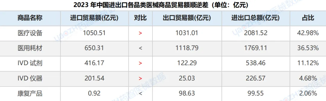 1、2023年中国进出口各品类医械商品贸易额顺逆差详情2023年,医疗设备、IVD试剂与IVD仪器进口贸易额大于出口贸易额,其余产品均为顺差。