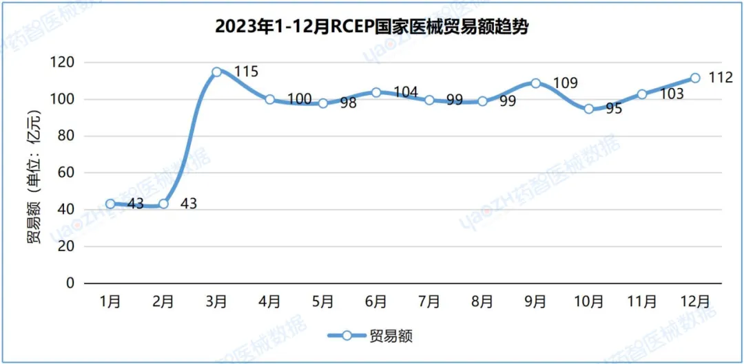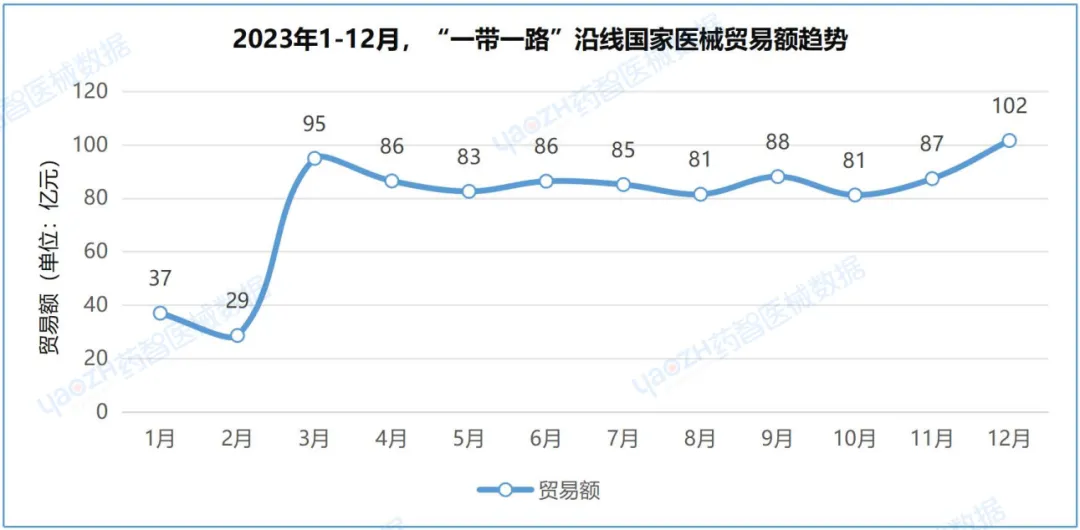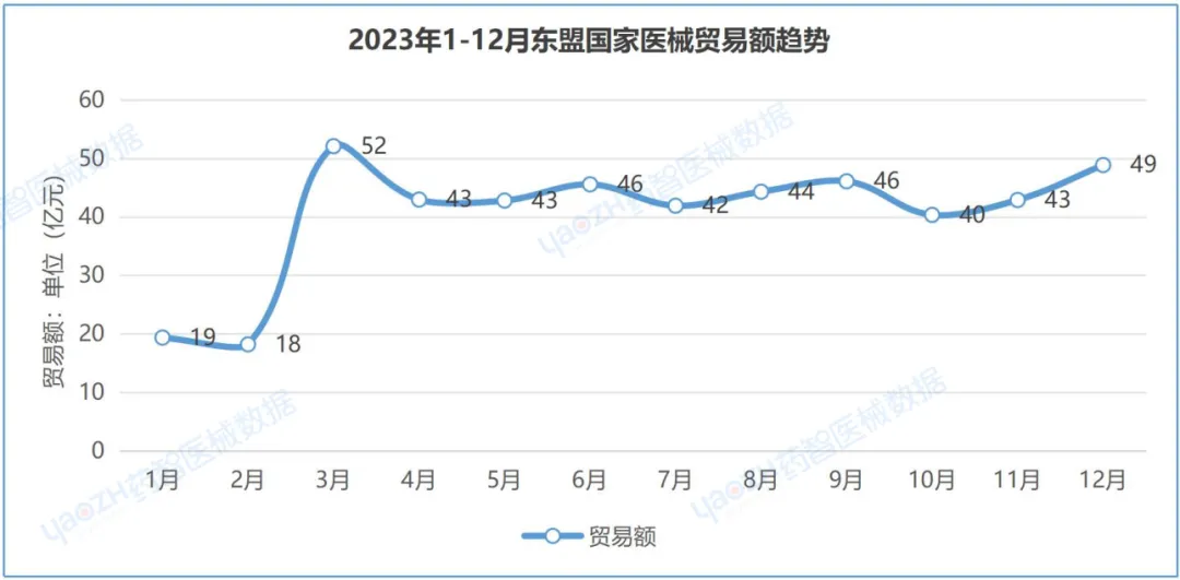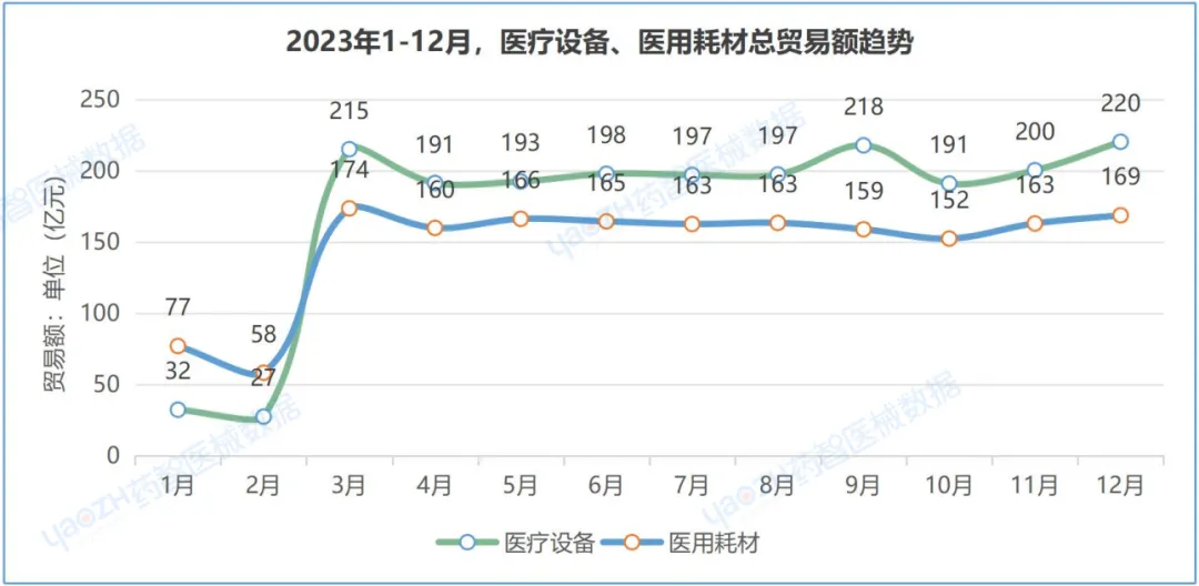 从主要产品总贸易额数据来看,2023年,医疗设备与医用耗材趋势大致相同,均在3月迅速回升,而后趋于平稳。