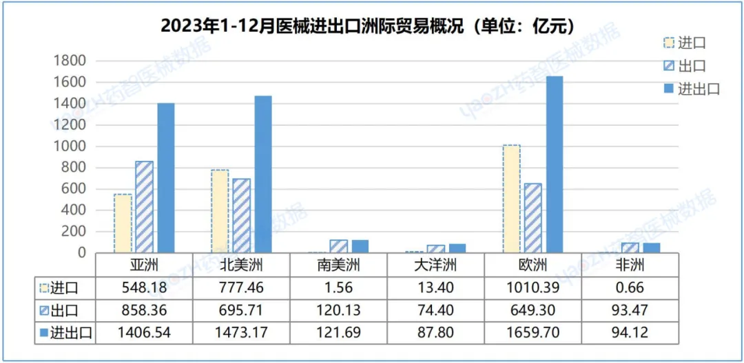 2023年,中国医械贸易主要集中在欧洲、北美洲,分别占比达34.27%、30.42%,贸易总额分别为1,659.70亿元、1,473.17亿元。其中,出口方面,亚洲出口金额占比第一,达34.45%,出口金额为858.36亿元,环比下降23.75%;进口方面,欧洲进口金额占比第一,达42.97%,进口1,010.39,亿元,环比增长4.18%。