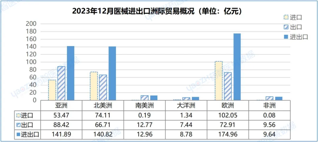 2023年12月,中国器械贸易主要集中在欧洲、亚洲,分别占比达35.78%、29.01%,贸易总额分别为174.96亿元、141.89亿元。其中,出口方面,亚洲出口金额占比第一,达34.30%,出口金额为88.42亿元,环比增长8.21%;进口方面,欧洲进口金额占比第一,达44.13%,进口102.05亿元,环比增长13.28%。