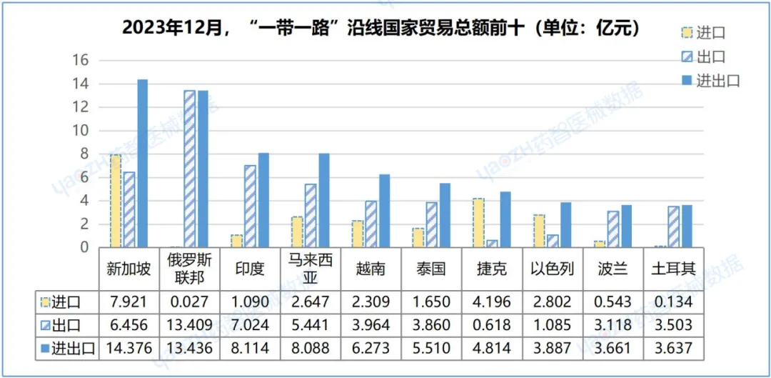 2023年12月,中国对“一带一路”沿线进出口101.60亿元,占中国全球贸易总额20.78%,环比增长16.35%。其中,出口74.851亿元,占中国总出口额29.03%,环比增长18.21%;进口26.753亿元,占中国总进口额11.57%,环比增长11.45%。对新加坡、俄罗斯联邦、印度、马来西亚、越南分别进出口14.376亿元、13.436亿元、8.114亿元、8.088亿元、6.273亿元,占同期中国对“一带一路”沿线国家进出口总值49.49%。