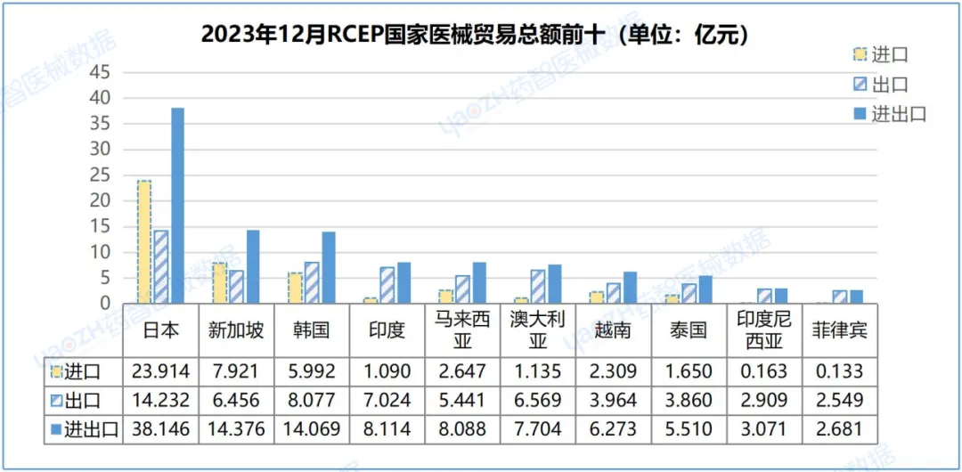 2023年12月,中国对RCEP国家进出口111.511亿元,占中国全球贸易总额22.80%,环比增长8.63%。其中,出口62.513亿元,占中国总出口额24.25%,环比增长6.01%;进口48.998亿元,占中国总进口额21.19%,环比增长12.17%。对日本、新加坡、韩国、印度、马来西亚分别进出口38.146亿元、14.376亿元、14.069亿元、8.114亿元、8.088亿元,占同期中国对RCEP国家国家进出口总值74.25%。