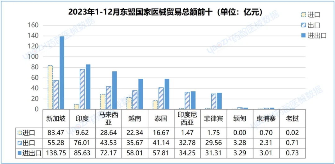 2023年,中国对东盟国家进出口485.41亿元,占中国全球贸易总额10.02%,环比下降17.88%。其中,出口320.73亿元,占中国总出口额12.87%,环比下降22.13%;进口164.68亿元,占中国总进口额7.00%,环比下降8.12%。对新加坡、印度、马来西亚分别进出口138.75亿元、85.63亿元、72.17亿元,占同期中国对东盟国家进出口总值61.09%。