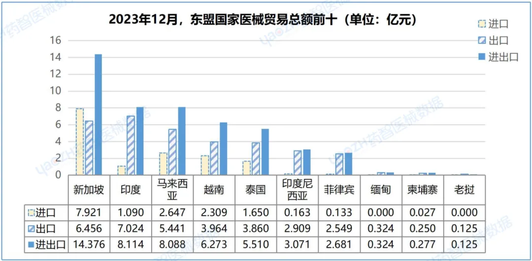 2023年12月,中国对东盟国家进出口48.869亿元,占中国全球贸易总额9.99%,环比增长13.93%。其中,出口32.930亿元,占中国总出口额12.77%,环比增长13.73%;进口15.939亿元,占中国总进口额6.89%,环比增长14.34%。对新加坡、印度、马来西亚分别进出口14.376亿元、8.114亿元、8.088亿元,占同期中国对东盟国家进出口总值62.57%。