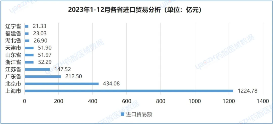 进口方面,2023年欧洲市场为最大进口贸易市场,市场份额占比达42.97%。中国医疗器械的主要进口地为美国、德国、日本,美国为中国最大的进口贸易国家,占中国进口市场的23.54%。2023年中国进口医疗设备的金额占比最高,达44.67%。中国医疗器械进口贸易中,上海市为进口额最大的省份,2023年进口额为1224.78亿元。