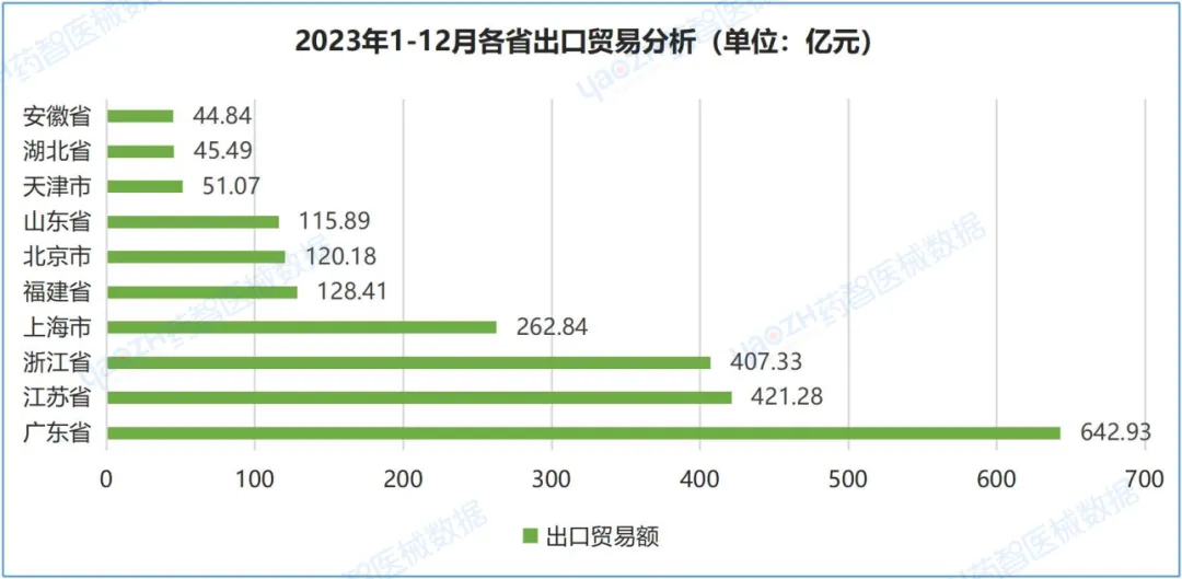 从2023年总体数据来看,出口方面,出口方面,亚洲市场为最大出口贸易市场,市场份额占比达34.45%。中国对RCEP国家、“一带一路”和东盟出口总额分别是628.30亿元、658.85亿元、320.733亿元;相比2022年,RCEP国家下降28.79%,“一带一路”下降12.92%,东盟下降22.13%。2023年,中国医疗器械的主要出口地为美国、日本、德国,美国为中国最大的出口贸易国家,占中国出口市场的24.43%。2023年,中国出口医用耗材的金额占比最高,达44.91%。中国医疗器械对外贸易中,广东省为出口额最大的省份,2023年出口额为642.93亿元。