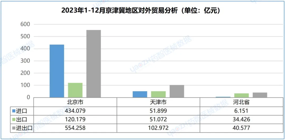 从京津冀地区进出口贸易额分析,2023年全年医疗器械进出口总贸易额为697.806 亿元,占中国进出口总贸易额14.41%。