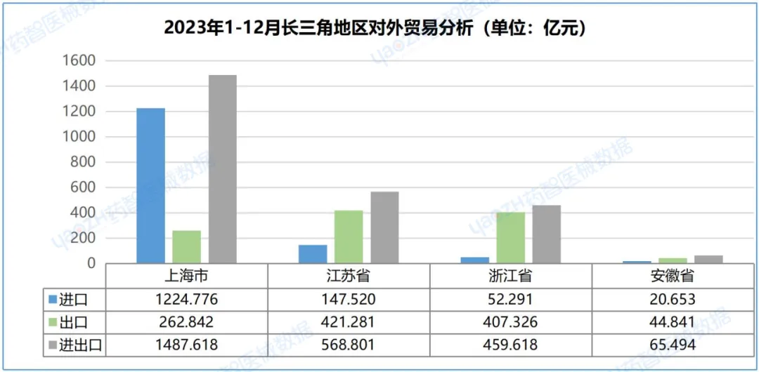从长三角地区进出口贸易额分析,2023年全年医疗器械进出口总贸易额为2581.531亿元,占中国进出口总贸易额53.30%。