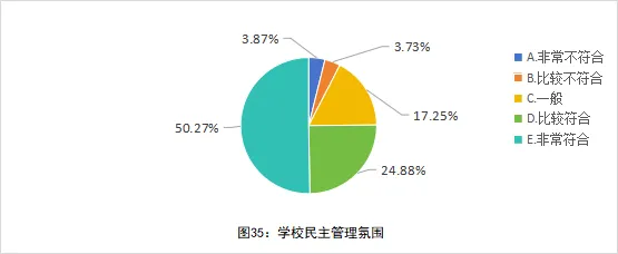 4.管理氛围。数据显示,认为学校管理制度和重大改革政策等出台前会广泛征求一线教师的意见的(“比较符合”+“非常符合”)占75.15%。这表明学校民主管理的氛围比较好(见图35)。