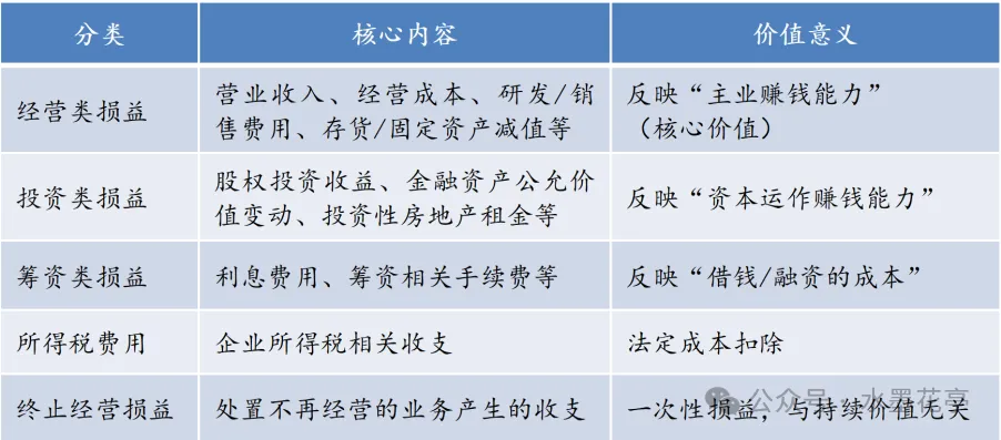 1.经营类损益:归集与核心业务直接相关的收支,包括营业收入、经营成本、销售/管理/研发费用、经营类资产减值损失(含商誉减值)等,精准反映“主业价值创造能力”。