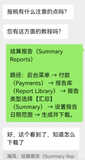 ? 路径:后台菜单 → 付款 (Payments) → 报告库 (Report Library) → 报告类型选择【汇总】(Summary) → 设置日期范围 → 生成并下载。