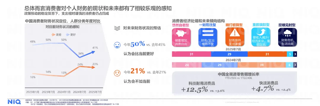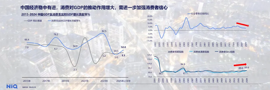 中国经济稳中有进,消费对 GDP 的推动作用持续增大,多轮国补与国债支持政策有效拉动内需。消费者对个人财务状况感知整体乐观,但仍有四成支出相对谨慎,经济下行与自身及家庭福利是主要担忧。