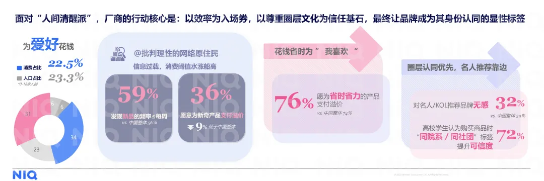 消费市场呈现 “功能质量奠基、健康便捷乘势、体验终成归途” 的特征,产品安全与质量是消费者首要考量,健康、便捷属性备受青睐。不同世代消费差异鲜明,婴儿潮一代乐于为乐享晚年的产品与新事物买单,X 世代秉持务实极简理念偏好本土健康产品,千禧一代注重品质体验与可持续性,Z 世代聚焦圈层认同为爱好消费。品牌需确立清晰价值主张,贴合目标世代特征精准触达。通过产品创新、情感体验与价值承诺,在全链路建立深度认同,实现与消费者的长期陪伴,解锁不同群体的消费潜力。