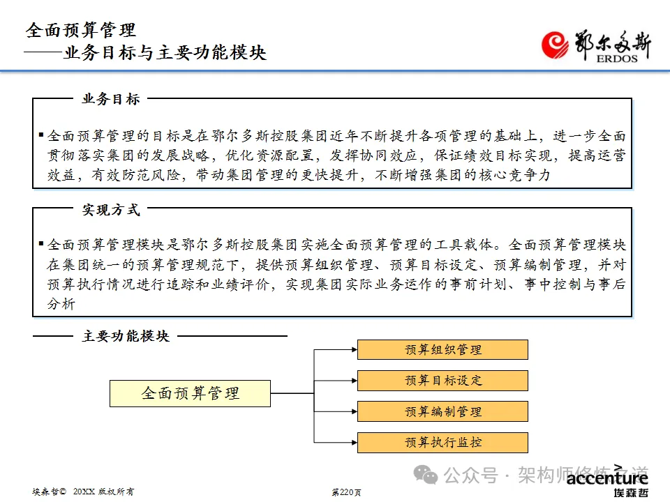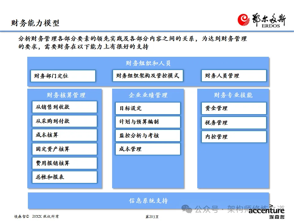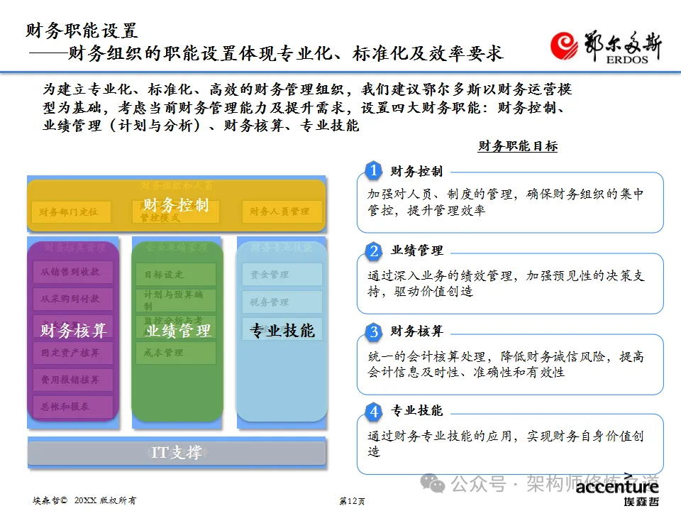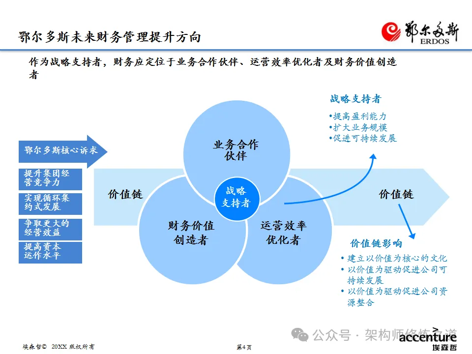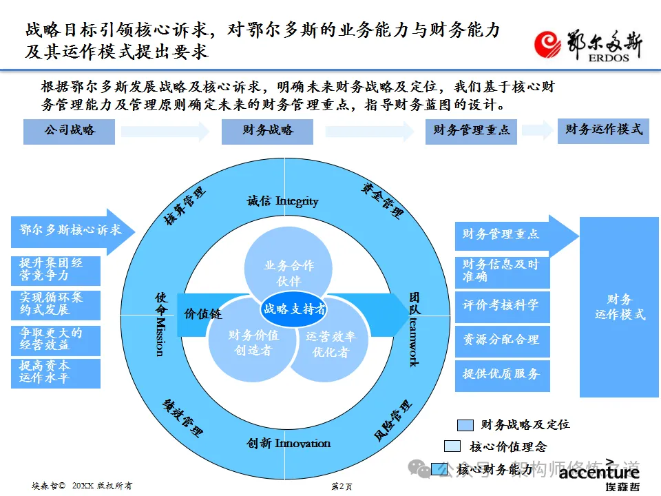 鄂尔多斯集团的财务转型并非孤立的行动,而是紧密围绕集团的整体战略目标展开。集团的战略目标是“创世界名牌,办百年强企”,这不仅要求企业实现循环集约式发展和更大的经营效益,还对财务管理提出了更高的要求。财务部门需要从传统的交易处理和控制角色,转变为战略支持者、业务合作伙伴、运营效率优化者以及财务价值创造者。