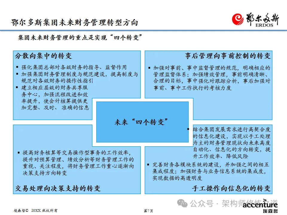 财务转型离不开信息化的支持,鄂尔多斯集团将全面升级其财务信息系统。通过建立集成化的财务平台,实现财务与业务系统的无缝对接,提升数据的透明度和共享性,为财务转型提供强大的技术支撑。
